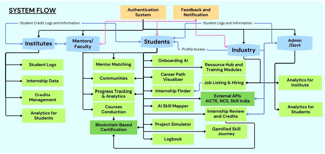 modules like the Internship Finder, AI Skill Mapper, Mentor Matching,